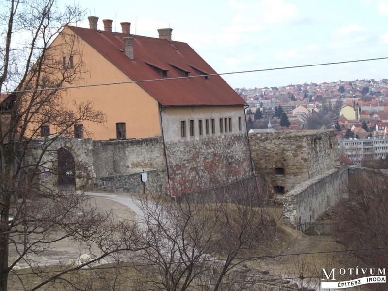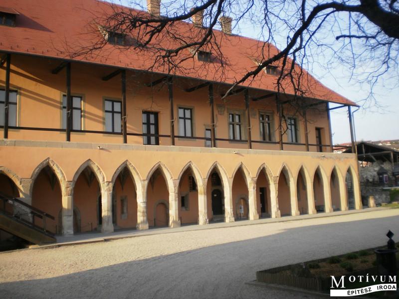 A gótikus palota és háttérben az északi várfal romjai.